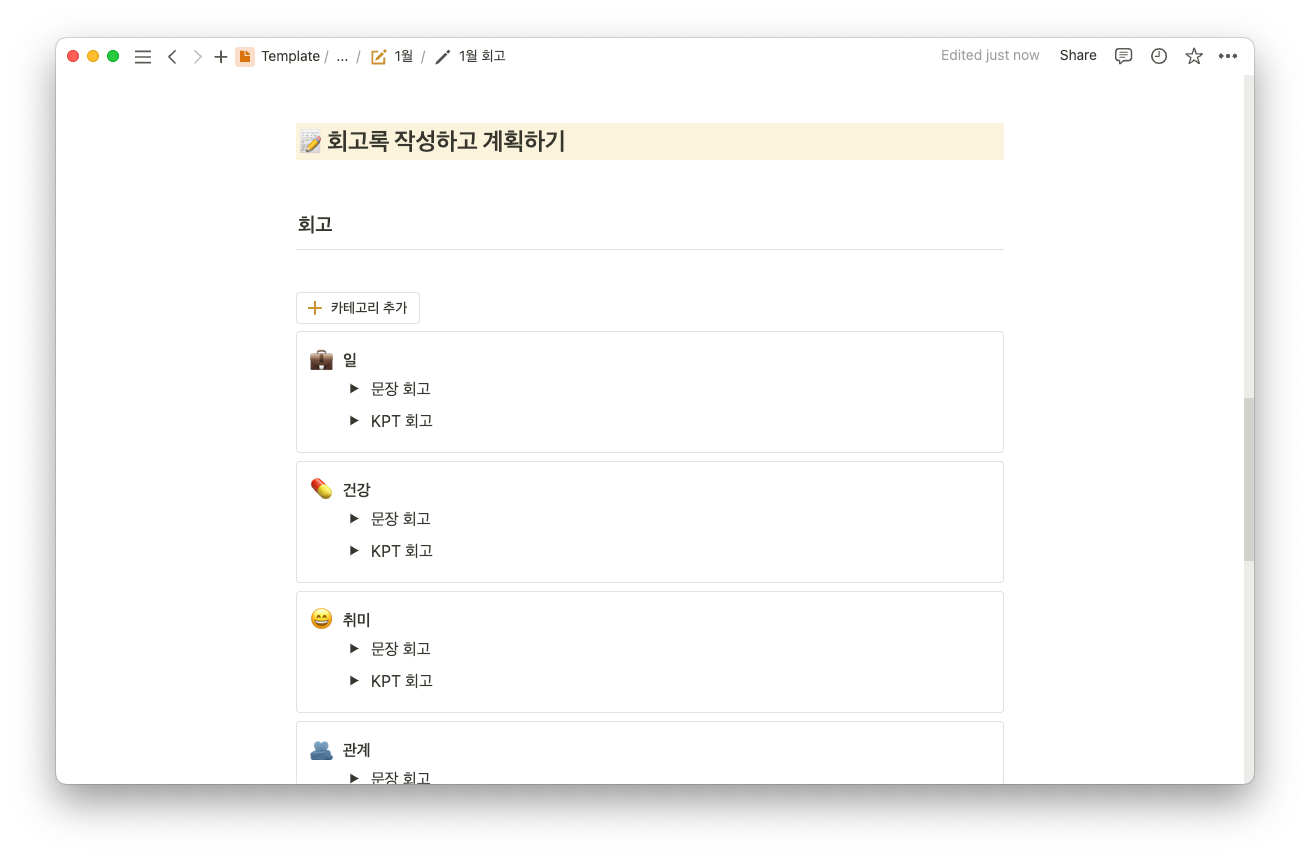 ์ผ, ๊ฑด๊ฐ, ๊ด๊ณ, ์ต๊ด, ๊ฐ์ ๋ฑ ์นดํ ๊ณ ๋ฆฌ๋ณ๋ก ๋์ ์ถ์ ๊ณจ๊ณ ๋ฃจ ์ฑ๊ฒจ๋ณผ ์ ์์ด์. ์ค๊ธ ๋๋ KPT ๋ฐฉ๋ฒ๋ก ์ ํ์ฉํด ํ๊ณ ๋ฅผ ์งํํด ๋ณด์ธ์!
