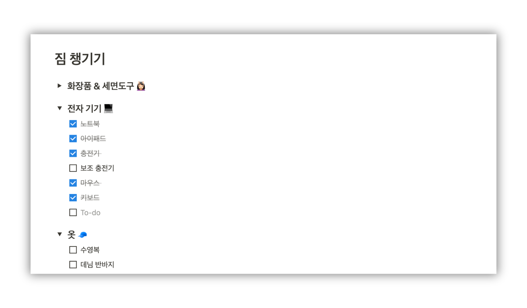 이렇게 준비물을 챙길 때는 엄청난 기능을 쓸 필요는 없고, 간단히 체크박스를 활용하면 좋아요 ✅ 하나씩 노션에 기록하면, 돌아올 때 빠진 짐이 없는지도 확인할 수 있어요.