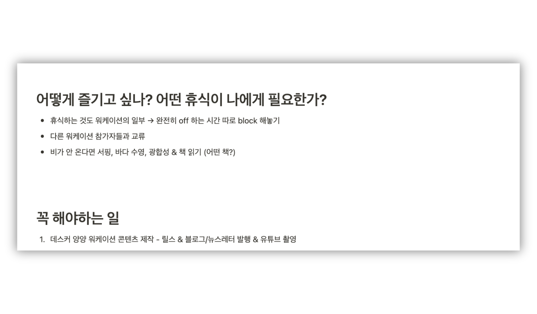 이번 워케이션은 데스커의 디깅 크루로 선정되어서 온 것인 만큼, 차분히 기록하며 계획하는 시간을 갖고 싶었어요. 그래서 다음 2가지 질문을 스스로에게 던졌습니다.