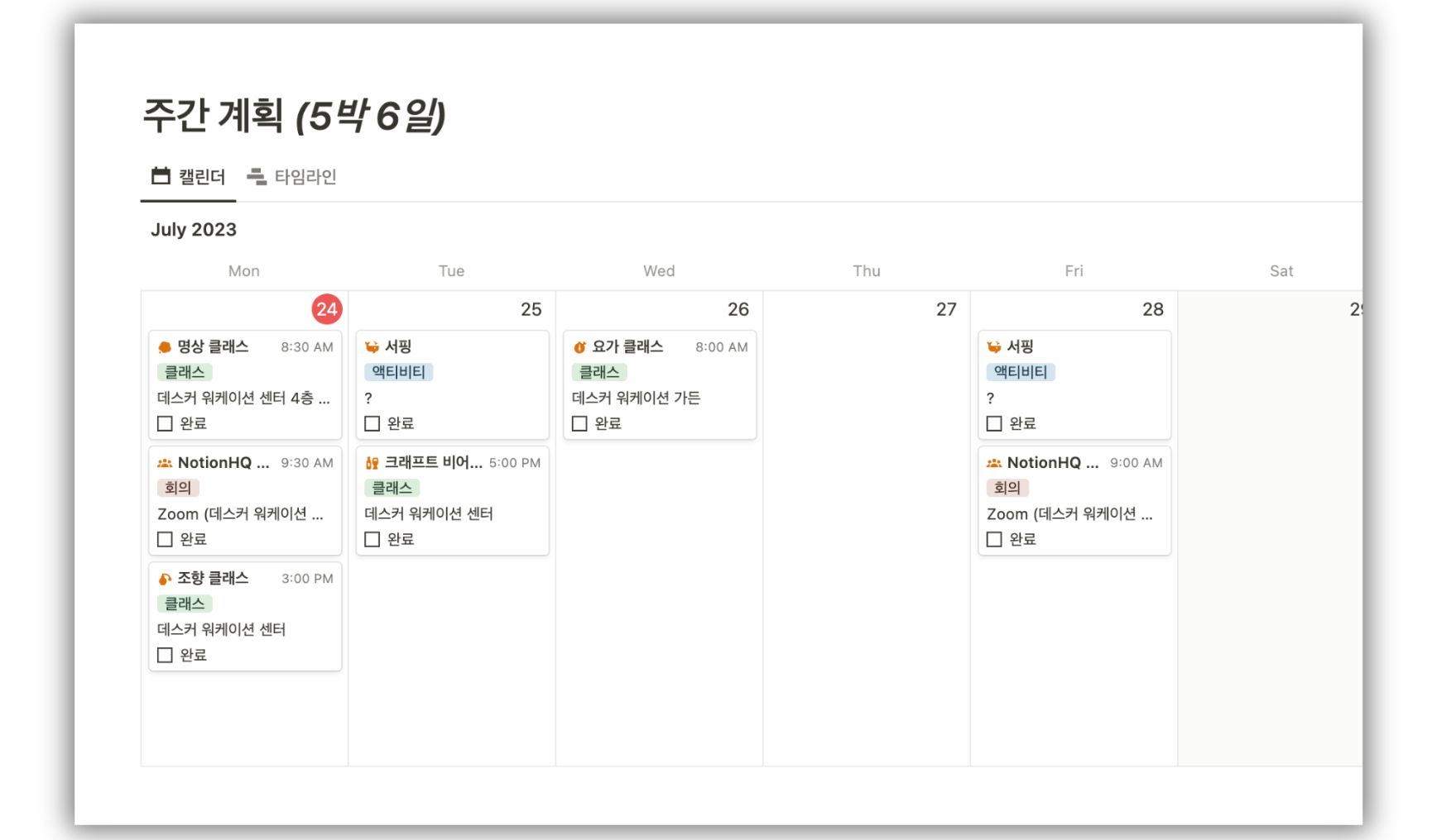 이렇게 간단히 계획을 세울 때는 캘린더 보기가 간편한 것 같아요. 특히 워케이션은 5박 6일이라, 캘린더 보기에서 월별이 아닌 '주별'로 볼 수 있게 설정했어요.