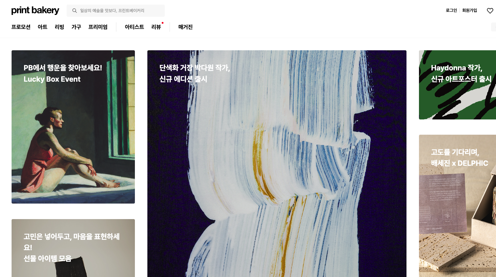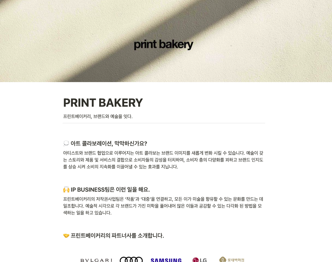 프린트베이커리는 일반 대중이 미술을 친근하게 접할 수 있도록 아트 분야에서의 혁신 사례를 다양한 방식으로 보여주고 있는 아트 플랫폼입니다. '프린트베이커리'라는 이름또한 우리가 가까운 베이커리에서 맛있는 빵을 쉽게 찾을 수 있듯이, 누구나 부담 없이 미술품을 즐길 수 있게 한다는 의미라고 합니다.